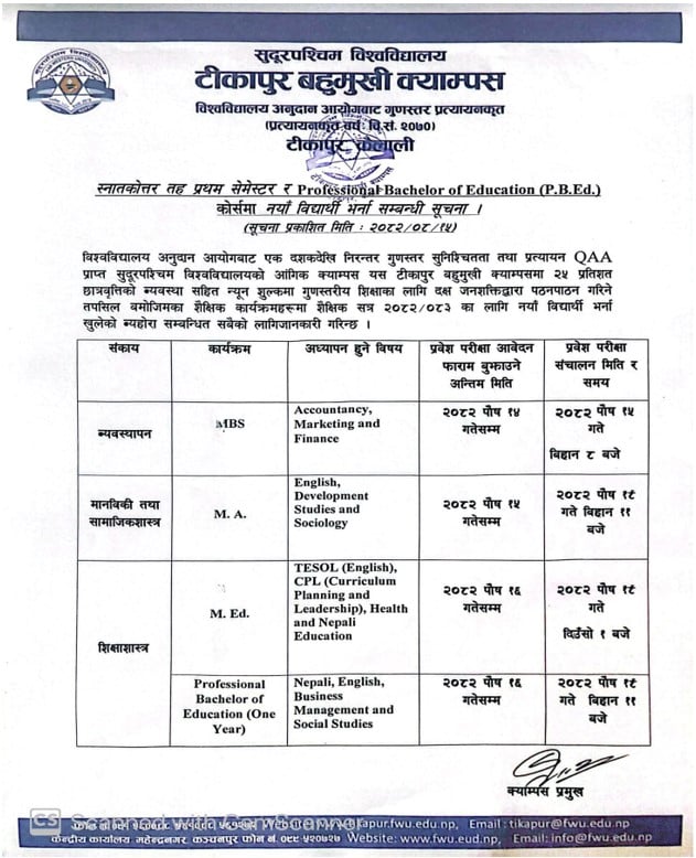 स्नातकोतर तह प्रथम सेमेस्टर र Professional Bachelor of Education (P.B.Ed) कोर्षमा नयाँ विद्यार्थी भर्ना सम्बन्धी सूचना |