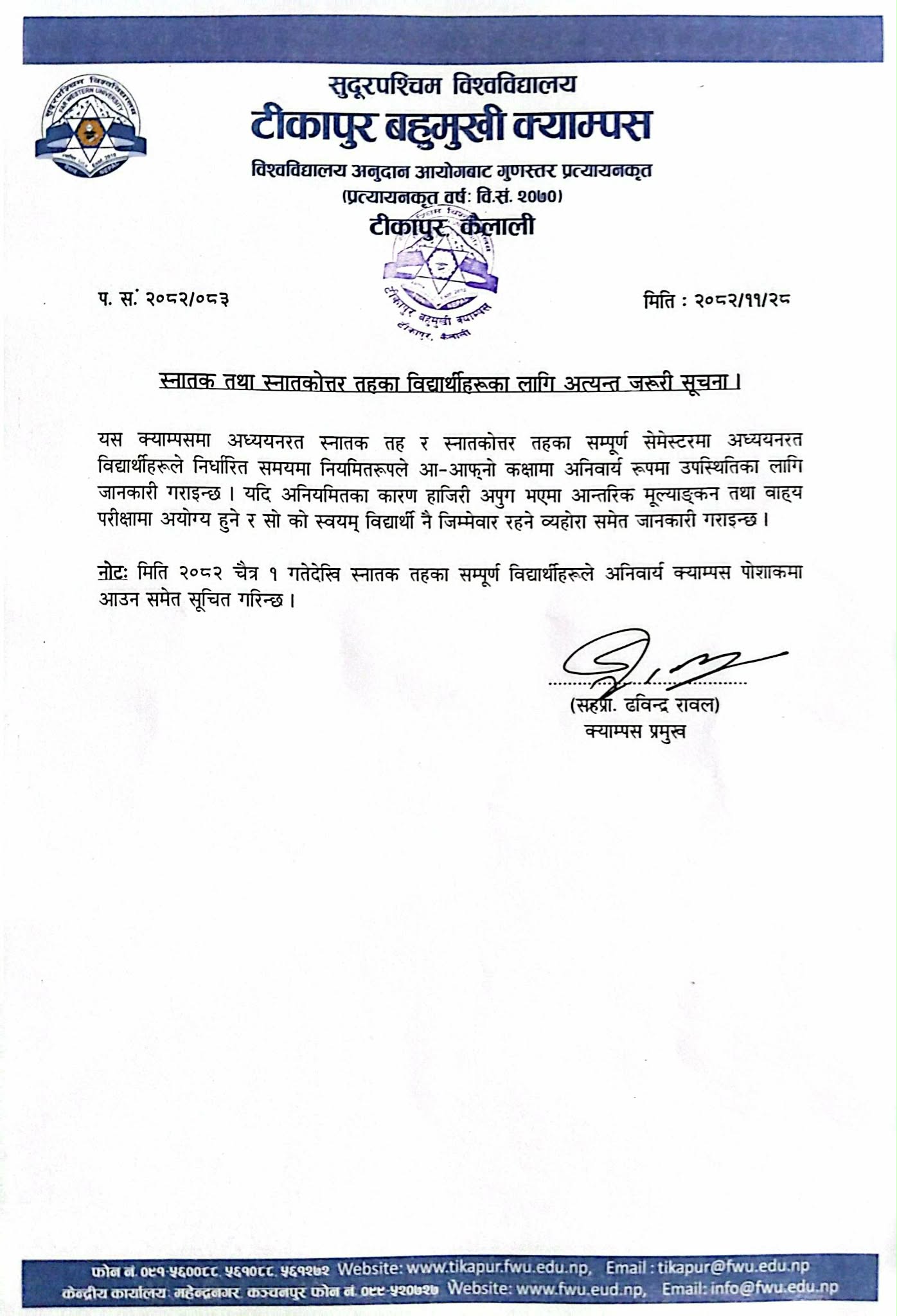 स्नातक तथा स्नातकोत्तर तहका विद्यार्थीहरुका लगि अत्यन्त जरुरी सूचना ।