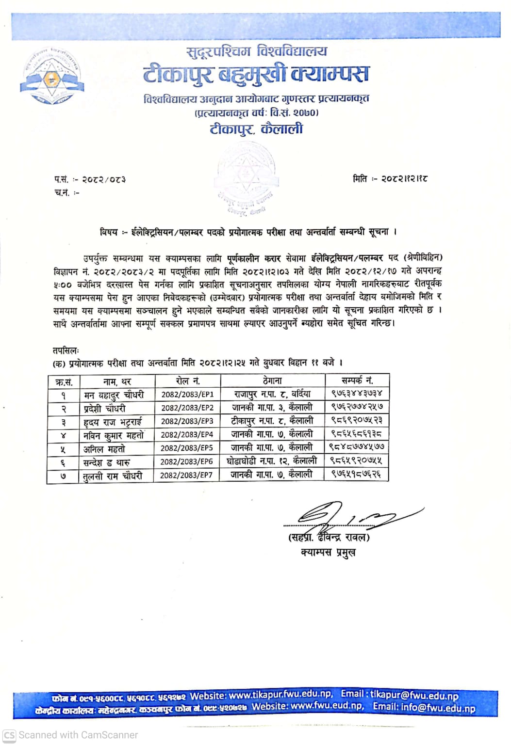 इलेक्ट्रीसियन / प्लम्बर पदको प्रयोगात्मक परिक्षा तथा अन्तर्वार्ता सम्बन्धी सूचना |