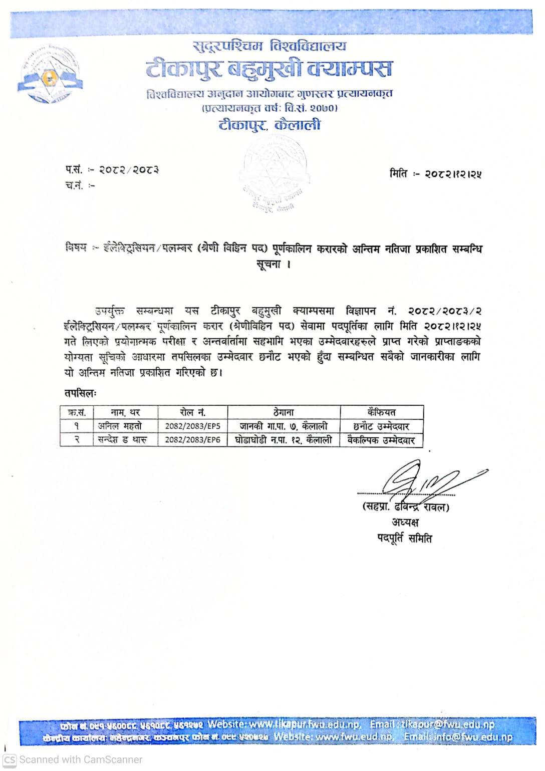 इलेक्ट्रीसियन / प्लम्बर (पुर्णकालिन करार) पदको अन्तिम नतिजा प्रकाशित सम्बन्धी सूचना ।